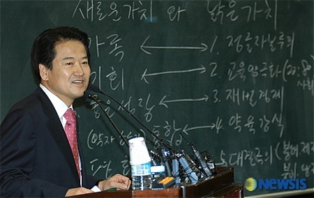 정 후보가 의총에서 직접 녹색 칠판을 준비해 '가족', '기회', '좋은 성장', '약자 및 소수자 통합', '평화' 등 '5대 지향점'을 써내려가며 의원들에 대한 '가치 강의'를 수행한 것도 그 일환이다. 이에 반해 그는 이명박 후보의 지향점을 '정글자본주의', '교육양극화', '재벌경제', '약육강식', '대결주의'로 대비시켰다. 이 후보와 자신의 대결은 '낡은 가치' 대 '새로운 가치'의 대결이라는 것.