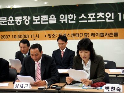 그러자 "한국 스포츠 역사를 대변하는 동대문운동장을 철거할 수 없다"며 스포츠인들이 뭉쳤다. 장재근 전 국가대표 육상선수, 박찬숙 전 국가대표 농구선수 등 각계 스포츠인들은 30일 서울 프레스센터에서 기자회견을 갖고 '동대문운동장 보존을 위한 스포츠인 100인 선언'을 발표했다.