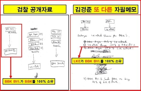 신당 정봉주 의원이 공개한 김 씨의 자필 메모에 따르면 "LKe뱅크가 BBK BVI를 100% 구매한다(LKeBank buys 100% of BBK BVI)"고 돼 있다. 이에 따라 LKe뱅크가 BBK BVI를 100% 소유했다는 게 정 의원의 주장이다. BBK BVI는 브리티시버진아일랜드에 소재한 BBK의 해외법인이다.