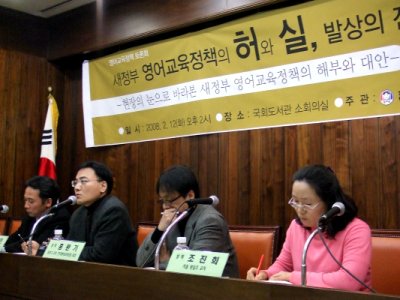 지난 12일 교육개혁시민운동연대, 범국민교육연대 등 단체로 구성된 '이명박 정부 교육정책 대응 공동행동'은 국회도서관 소회의실에서 토론회를 열었다. '현장의 눈으로 바라본 새정부 영어교육정책 해부와 대안'이라는 주제로 열린 이번 토론회에서는 사범대 영어교육과 교수를 비롯해 현직 영어 교사들이 나와 인수위 영어 교육 정책의 문제점을 낱낱이 지적했다.