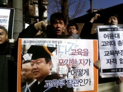이에 앞서 지난 14일 학교 측으로부터 '퇴학' 결정을 받은 고려대 출교생 7명은 15일 오전 서울 삼청동 대통령직 인수위원회 앞에서 기자회견을 열고 "어윤대 전 고려대 총장의 교육과학부 장관 내정을 반대한다"고 밝혔다.