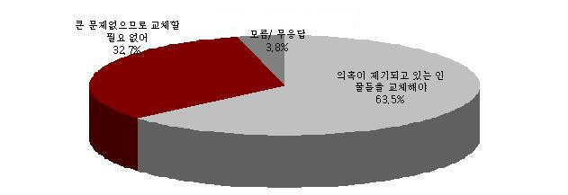특히 지난해 대선에서 이명박 대통령을 지지한 층에서도 교체해야 한다는 여론이 61.7%로 교체할 필요 없다는 의견 35.8%보다 월등히 높았다.