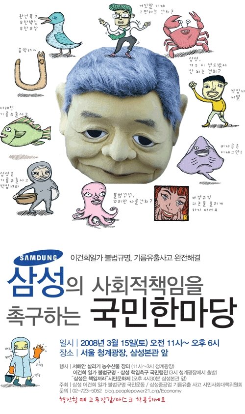 참여연대, 환경운동연합 등 사회단체와 시민들로 구성된 '삼성중공업 기름유출사고 시민사회대책위원회'와 '삼성 이건희 불법규명국민운동'은 오는 15일 서울 청계광장과 삼성 본관 앞에서 '이건희 일가 불법규명과 기름유출사고 완전해결을 위한 삼성의 사회적 책임을 촉구하는 국민한마당'을 개최할 예정이다.