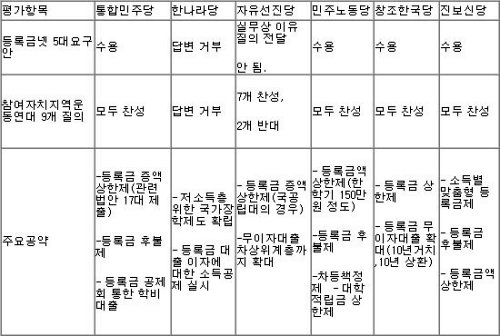 총선을 앞두고 최대의 민생 현안으로 떠오른 대학 등록금 문제에 대한 각 당의 대책 및 공약을 평가한 내용이 공개됐다. 지난 대선까지 '반값 등록금'을 중점 공약으로 내세웠던 한나라당은 '매우 소극적'이라는 가장 낮은 점수를 받았다.