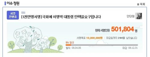 포털사이트 '다음'의 청원게시판에서 진행되는 '이명박 대통령 탄핵' 서명에 동참한 인원이 2일 오전 10시 42분 현재 50만 명을 돌파했다. 지난달 30일 10만 명이었던 서명 인원이 이틀만에 50만 명으로 늘어난 것. 현재도 1초당 20~30명 씩 서명자 수가 늘어나고 있다.