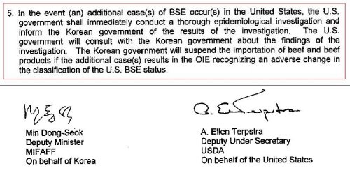 양측 협상 대표가 서명한 이 문서 5항에는 "미국에서 광우병이 추가로 발생하는 경우 (…) 추가 발생 사례가 국제수역사무국(OIE)의 미국 광우병 지위 '하향 조정(adverse change)' '결정(recognizing)'을 이끌어낼 경우 한국 정부는 쇠고기, 쇠고기 제품 등의 수입을 중단한다"고 명시돼 있다.
