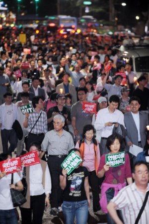 뒤늦게 행진에 합류했다는 이모 씨는 "9시 뉴스에서 장관 고시를 보고 뛰어 나왔다"고 말했다. 옆에 있던 강모 씨는 "사실 진작에 이렇게 많이 나왔어야 한다"며 "점점 더 많은 시민들이 거리로 나왔으면 좋겠다"고 말했다. 그는 "이명박에 대한 솔직한 심정을 듣고 싶나"라며 "차라리 중국에서 돌아오지 않기를, 아니면 못 돌아오기를 바라는 심정"이라고 덧붙였다.