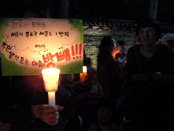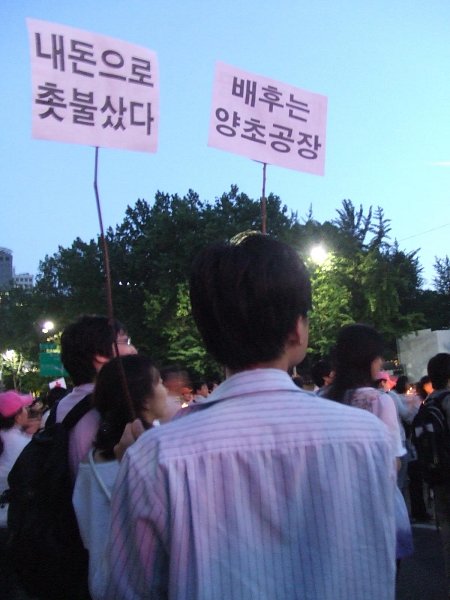 서울시청 앞 광장에서 차고 넘친 시민들은 차도와 덕수궁 앞 인도까지 가득 메웠다. 차도에서 촛불을 든 채 모여 앉아있던 10여 명의 20대 여대생들은 인터넷 커뮤니티에서 만난 사이라고 했다. 전국 각지에서 모였다는 이들은 "왜 나왔냐"라는 질문에 입을 모아 "이명박 때문"이라고 외쳤다.