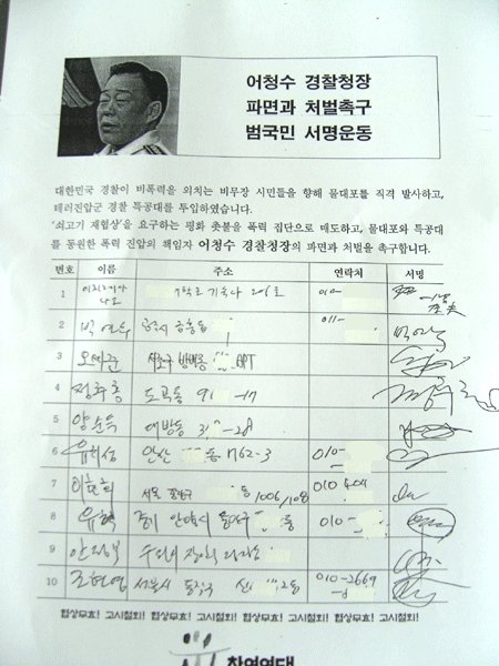 참여연대는 "평화적 촛불행진을 하던 시민에 참담한 폭력을 행사한 경찰에 항의하기 위해 지난 4일부터 경복궁역과 청계광장, 서울광장 인근에서 경찰청장 파면과 처벌을 촉구하는 거리서명 캠페인을 진행했다"며 "그 결과 10일 저녁까지 6일간 거리서명에 1만8130명이 넘는 시민들이 동참했다"고 밝혔다.