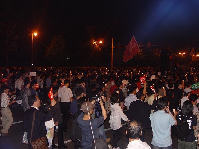 한국방송(KBS) 본사 앞에서 촛불을 들고 "한나라당사로 진격하자"며 행진을 시작한 약 2만 명의 시민은 한나라당사가 보이자 "한나라당은 꺼져라"는 구호와 함께 일제히 야유를 쏟아 냈다. 일부 시민들은 굳게 닫힌 한나라당사를 향해 달걀을 던지기도 했다.