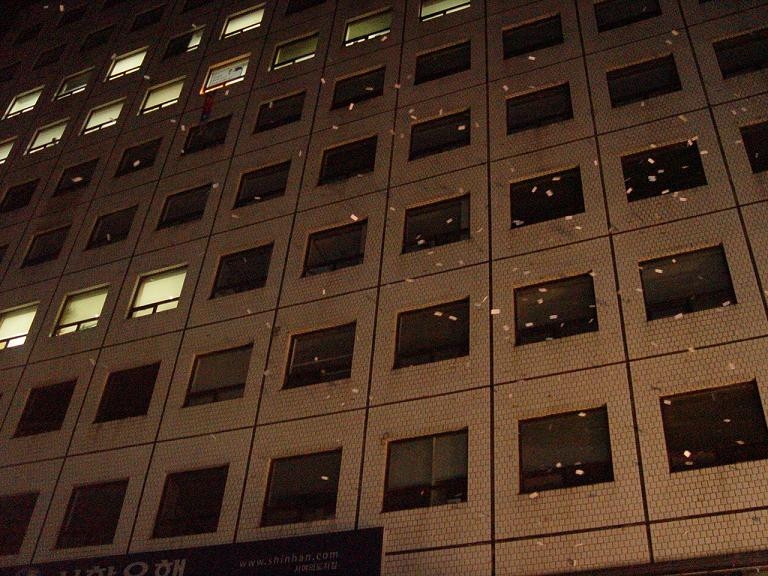 14일 새벽 여의도 한나라당사의 모든 불은 꺼져 있었다. 다만 건물을 에워싼 촛불만 빛났다.