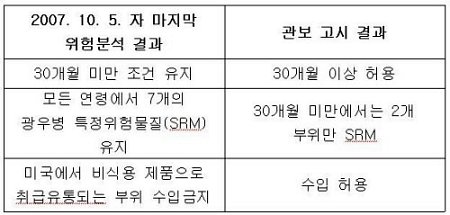 지난해 12월 농림부가 고시한 '지정 검역물의 수입 금지 지역' 규정에 따르면 쇠고기 등 육류는 '지정 검역물'에 속하며, 이들을 수입할 경우 수입 위험 분석을 실시하도록 돼 있다. 그 결과 위험이 없다고 판단되는 경우 농림부는 '수입 위생 조건'을 정하게 돼 있다. 2006년 3월 이미 수입이 허용된 미국산 쇠고기 역시 이 규정이 적용된다.