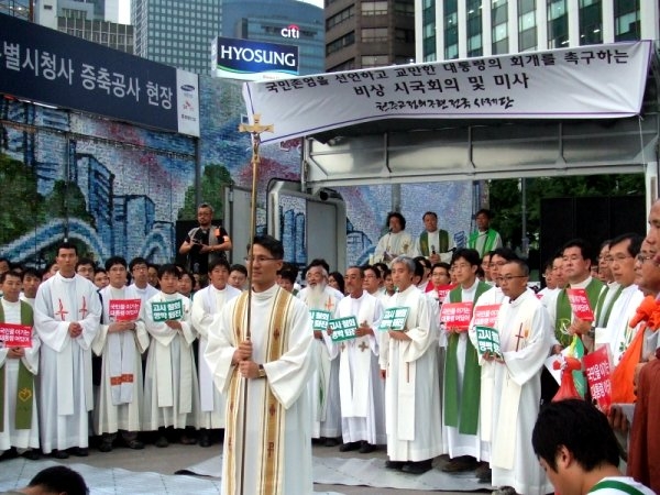 사제단은 "예언자의 전통에 따라 공권력이 저지르는 무참한 폭력을 꾸짖고, 시민들을 위로했던 거룩한 전례를 정치참여로 모는 것은 독성(瀆聖)의 죄가 아닐 수 없으며 이웃의 상처를 싸매주도록 명하신 예수님의 가르침에도 어긋난다"고 지적했다. 이들은 "앞의 신문들은 1970~80년대에 우리가 인권과 민주주의를 위해 싸울 때도 같은 논리로 권력을 편들어 봉사하면서 사제들의 헌신을 비난했다는 점을 상기시켜 드린다"고 덧붙였다.