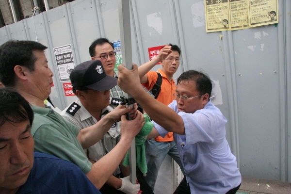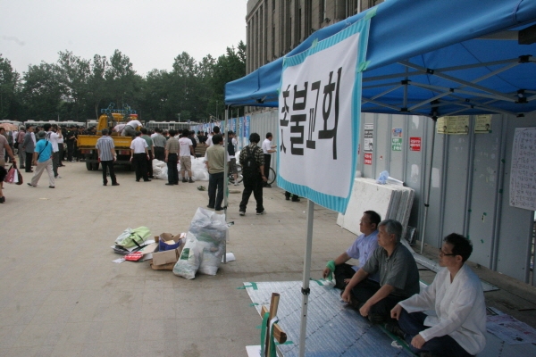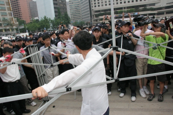 이날 오후 서울시는 시청 앞 광장에 세워져 있던 기독교단체, 진보신당, 사회당, 아고라, 광우병 국민대책회의 등의 천막을 경찰의 지원으로 강제 철거했다. 애초 단식 기도를 지난 5일 끝내고 이날 자진 철거를 한 천주교정의구현전국사제단의 천막을 제외한 단체들의 천막을 서울시가 강제 철거한 것이다.