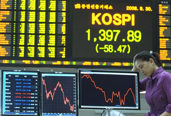 구제금융안 부결 소식은 마치 '괴물과 같은' 공포를 한국 증시에 전염시켰다. 장 개장과 함께 코스피지수는 곧바로 1400선 아래로 곤두박질치며 한 때 1376선까지 밀려났다. 전날 대규모 순매수에 나섰던 외국인이 1586억 원 순매도로 돌아서며 하락을 부채질했다.
