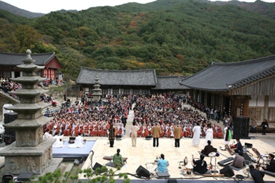각황전이 바라다 보이는 대웅전 앞마당에 마련된 무대 주변의 쌀쌀한 공기는 공연이 시작되자 소리와 어우러진 교감의 열기로 뜨거워졌다. 객석에서는 천 명가량의 관객이 두 손을 모으고 공연 시작을 알리는 스님들의 묵언행진 모습을 지켜보았다. 무엇이 이들을 여기에 불러 모았을까, 사람들의 얼굴에 번진 깊은 고요의 기도를 보면서 생각했다. 스님들이 맨 앞자리에 앉자 사물(운판, 목어, 법고, 종) 소리가 울려 퍼졌다. 중생이 번뇌에서 벗어나 깨달음을 이루게 해준다는 사물이 내는 소리는 가슴 저 밑바닥을 흔들어 내가 저지른 죄업을 모두 떠올리게 했다. 마음이 맑을 때 많은 것이 나를 찾아온다. 내 삶을 거쳐 간 선과 악, 죄와 덕이 환히 떠오르다가 차츰 맑게 씻겨나간 듯 마음이 일순 맑고 차분해졌다. 적멸의 상태에 빠진 객석을 뒤흔든 사물의 순서가 끝나면서 본격적인 공연이 시작되었다.