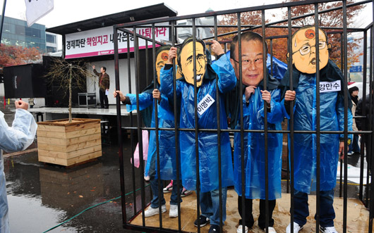 ▲시장의 신뢰가 무너진 마당이라 정부가 내놓은 어떤 유동성 대책, 기업 구제 대책도 별다른 효과를 얻지 못하고 있다. 지난 15일 오후 서울역광장에서 민주노동당과 한국진보연대 회원들이 정부 경제정책 규탄대회를 열고 있다. ⓒ뉴시스