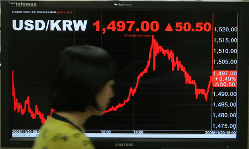20일 원-달러 환율은 전날보다 50.5원(3.49%) 폭등, 1497.0원으로 마감했다. 장중 한 때는 달러당 1517원까지 올라 지난 1998년 3월 13일(1521원) 이후 10년 8개월 만에 1500원선마저 뚫고 올라가기도 했다.