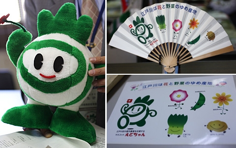 | ▲ 도쿄도 에도가와구의 전통 채소 '코마츠나'를 캐릭터로 만든 에도짱 인형 (왼쪽). 에도가와시는 코마츠나 외에도 콩, 나팔꽃, 감자 등 에도가와시의 특산물들을 캐릭터화해 부채나 스티커 등으로 만들었다. 에도가와시의 이러한 노력은 '코마츠나' 홍보에 도움이 될 뿐아니라 아이들이 일본의 전통 채소를 더욱 친숙하게 느끼게 한다. ⓒ프레시안 |