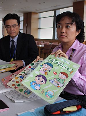 | ▲ 일본 초등학교의 '식육' 교재를 보여주는 코가 유키코 영양사. 그 옆에 앉은 야니키바 노부히코 주사는 "지산지소 운동이 이어지기 위해서는 먹을거리 교육이 필수다"라고 강조했다. ⓒ프레시안 |