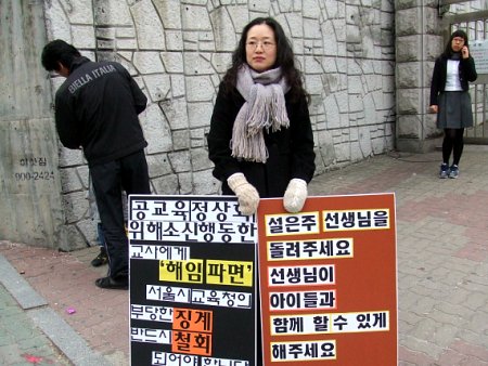 | ▲ 김경숙 교사는 일제고사 대신 체험학습을 허락했다가 해임 통보를 받은 서울 유현초등학교 설은주 교사의 징계 철회를 요구하며 1인 시위를 벌였다. ⓒ프레시안 |