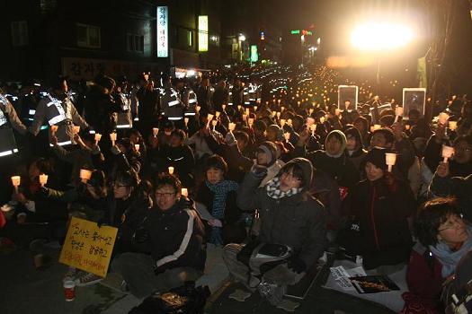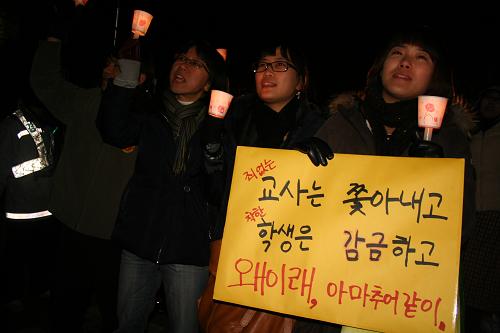 | ▲ 추운 날씨에도 오후 내내 계속된 집회와 촛불 문화제에는 연인원 2000명이 넘는 교사, 학부모, 학생들이 참가해 큰소리로 '징계 철회'와 '공정택 퇴진'을 외쳤다. ⓒ프레시안 |