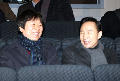 | ▲이명박 대통령이 지난 15일 대학로 동숭아트센터에서 영화 <워낭소리>를 관람하러 갔다. 이 대통령은 이충렬 감독에게 "관객이 얼마나 들어왔느냐"고 묻는 등 수익에 큰 관심을 보였다. ⓒ연합 |