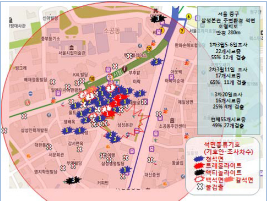 | ▲ 삼성본관 주변 약도. 반경 280m 안에서 석면이 검출된 장소가 표시돼 있다. ⓒ시민환경연구소 |