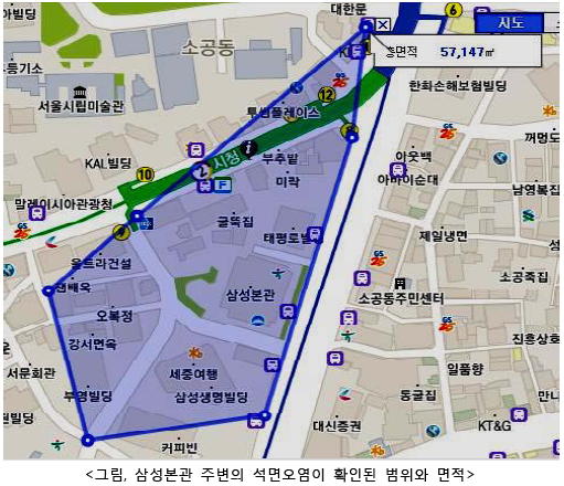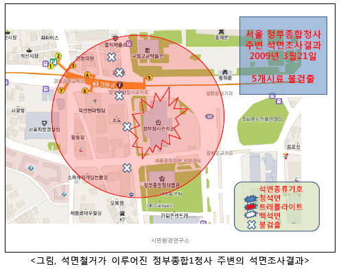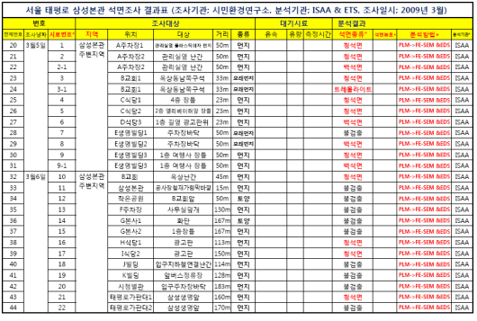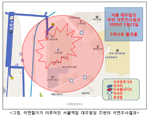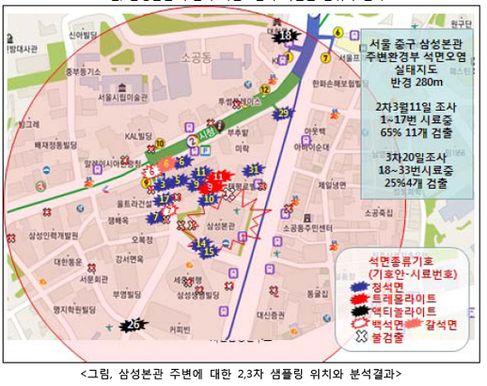 시민환경연구소 등은 지난달 25일 발표한 보고서에서 "옛 삼성 본관 주변 반지름 280m 안에 있는 건물 주변 바닥과 옥상, 시설물 위 등에서 17개 먼지·토양 시료를 채취해 분석한 결과, 65%인 11개 시료에서 독성이 강한 청석면이 발견됐다"고 밝혔다. 그리고 이들 단체는 "특히 삼성 본관 뒤 공중전화 부스 아래 먼지에서 석면이 검출되는 등 많은 시민들이 이용하는 공간이 석면에 오염돼 있는 사실이 확인됐다"고 덧붙였다.