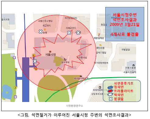 | ▲ 서울시청 건물에서도 석면철거가 이뤄졌으나, 주변에서 석면이 검출되지 않았다. 옛 삼성본관에 대한 조사 결과와 대조적이다. ⓒ시민환경연구소 |