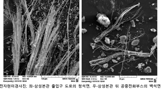 | 시민환경연구소, 서울대 보건대학원 직업환경건강교실, 한국석면추방네트워크 등이 지난달 25일 내놓은 보고서에 담긴 사진. 석면은 사람에게 암, 악성중피종 등을 일으킨다. 석면 가운데서도 특히 청석면은 치명적인 발암물질로 꼽힌다. ⓒ시민환경연구소 |