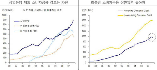 또한 미국의 소비자금융 위축이 한국과 달리 주로 리볼빙(일정부분 이상 대출 대금 납부시 나머지 대금이 다음 결제일로 자동 연장되는 대출제도) 중심으로 진행되고 있는 점, 그리고 점차 非리볼빙 시장으로 확산되고 있는 점도 소비 수요 회복에 걸림돌로 작용할 수 있다.