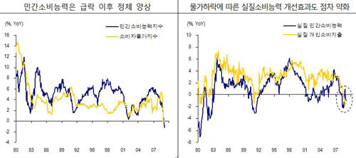 소비 추가 악화를 점칠 수 있는 근거는 더 있다. 지난해 4분기 가파른 물가 하락으로 다소 회복기미를 보이던 소비자물가 수준을 감안한 실질 민간소비능력 역시 최근 들어 재차 악화되는 추세다. 실질소비 회복이 다시 둔화될 가능성이 높아진 셈이다.