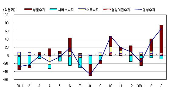 한국은행이 29일 '2009년 3월중 국제수지 동향(잠정)'을 발표했다. 3월 경상수지는 66억5000만 달러 흑자로 역대 최대치를 기록했다. 이에 따라 올해 1~3월 누적 경상수지 흑자는 85억8000만 달러에 달한다.