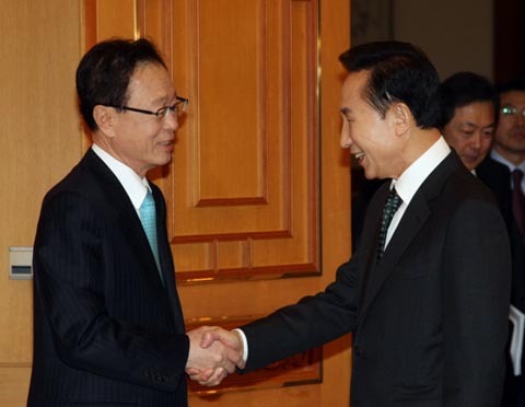 | ▲ 이명박 대통령과 박희태 한나라당 대표가 6일 조찬회동에 앞서 악수하고 있다. ⓒ청와대 홈페이지 |
