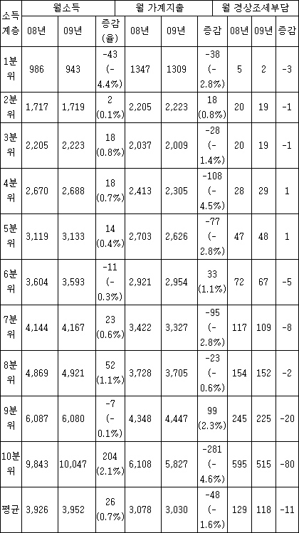 | * 자료출처:월소득 10분위별 가구당 가계수지(국가통계포탈 중 가계동향조사) * 대상기간은 08년 1/4분기와 09년 1/4분기임 |