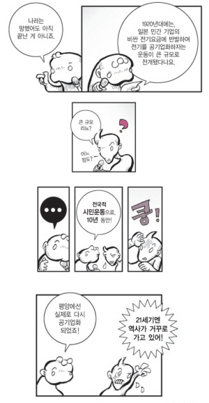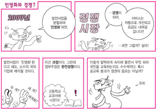 오늘날 빈부 차는 더 커지고 일자리는 더 위태위태하며 FTA는 몰려오고 민영화는 몰아친다. 그러나 그 의미는 숫자에 가려져 있다. GDP 몇%, 교역량 및 몇 위라는 알쏭달쏭한 암호의 그늘에 감춰진 이야기, 즉 철수는 재개발로 부자가 되지만 영희는 삶의 터전을 잃어버리고 쫓겨나리라는 이야기를 굳이 들추어내는 건 의미 있는 일이 되리라. 지금 시점에 이 만화를 모아 책을 묶자던 편집자님의 말씀은 옳았다." (머리말)