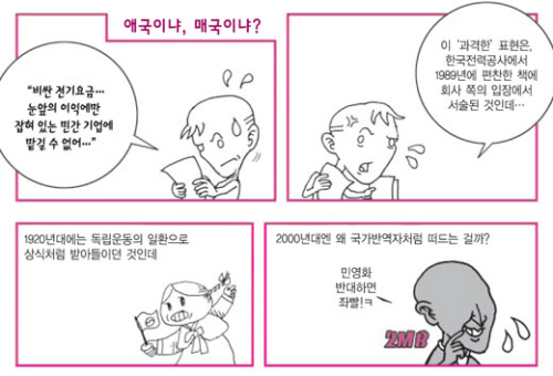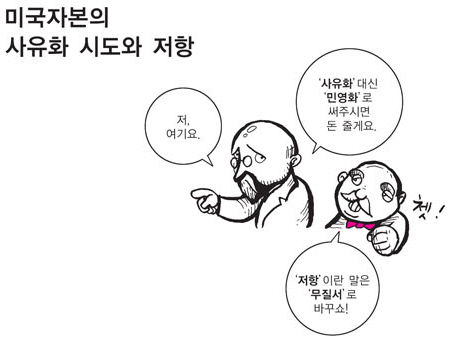 "공공 부문 민영화는 절대선이며, 자유무역은 모든 이들에게 이롭다"는 주장에 의심을 품으면 어느새 '반(反)기업', '반(反)시장'이라는 꼬리표가 붙는다.