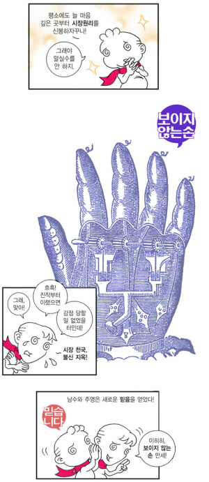 이 책 46페이지를 펼치면, 두 쌍의 따옴표에 묶인 글귀가 있다. "자유무역은 누구에게나 이득이 되는 거야", "어디까지나 이론적으로는". '자유무역의 허와 실'을 다룬 내용의 도입부다. 불과 13페이지 분량의 만화에, "자유무역은 모든 이들에게 이롭다"는 주장의 맹점이 잘 묘사돼 있다. 조금 부족하다 싶은 독자를 위해서는, 경제학자 우석훈의 글이 바로 뒤에서 기다리고 있다.