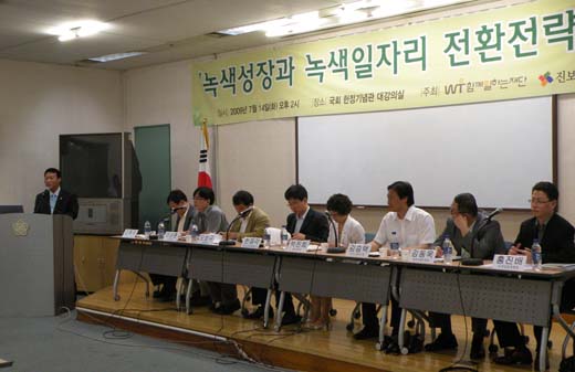현재까지 드러난 이명박 정부의 '녹색성장'에는 이런 고민들이 전혀 담겨 있지 않다. 새 성장동력으로 '녹색경제'에만 관심이 있다. 자신의 임기인 2012년 까지 30조 원에 가까운 재정을 투입해 대대적인 토목공사를 벌이는 '4대강 살리기'가 현 정부 녹색 정책의 핵심이다. 또 4년간 '녹색성장' 정책을 통해 창출하겠다는 96만 개의 일자리의 97%가 건설분야의 단순노무직이며, 임금수준과 고용기간을 제시하고 있는 일자리는 24%에 불과하다. 이명박 정부가 창출하겠다는 '녹색 일자리'의 대부분이 '저임의 일회용' 일자리라는 얘기다. 한 연구원은 핵심적으로 "이명박 정부의 '녹색성장'은 온실가스 감축을 포함한 사회의 근본적인 생태적 전환에 대한 비전을 갖고 있지 못하다"고 지적했다.