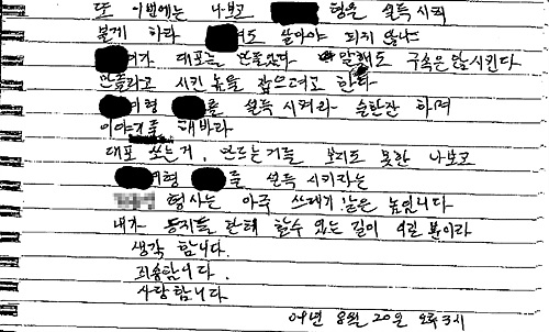 C 형사는 '건너 집기' 수사로 '또 불어라, 넌 지금 30% 밖에 안 불었다' 그러면서 '네가 더 말을 하지 않으면 이제와서 너를 도와줄 수 없다.' 이런 X 새끼가 어디 있습니까. 나 역시도 죽일 놈인데 C 형사도 죽일 놈입니다. 조사실에서는 가만히 있다가 화장실이나 담배 필 때마다 '더 불어라, 그래야 도와준다. 너 살아야 되지 않냐. 시원하게 불어라.' 오후 3시에 들어가서 나올 때는 담배 20가치를 다 피웠으니 20번 정도는 회유, 협박을 하는 놈입니다. 또 이번에는 나보고 '** 형을 설득시켜 불게 하라. **도 살아야 되지 않냐. &&이가 대포를 만들었다. 말해도 구속은 안 시킨다. 만들라고 시킨 놈을 잡으려고 한다. **이 형 &&를 설득시켜라. 술 한잔하며 이야기를 해봐라.' 대포 쏘는 거, 만드는 거를 보지도 못한 나보고 **이 형, &&를 설득시키라는 C 형사는 아주 쓰레기 같은 놈입니다. 내가 동지들한테 할 수 있는 길이 이길 뿐이라 생각합니다. 죄송합니다. 사랑합니다. 09년 8월 20일 오후 3시 |