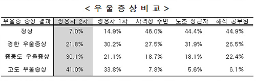 우울증 결과는 파업이 한창이던 지난 6월 실시했던 1차 조사보다 무려 16%포인트나 높은 것이었고, 그 가운데 당장 치료가 필요한 고도 우울증상은 미군 폭격장이 근처에 있던 매향리 주민보다 6배나 많았다.