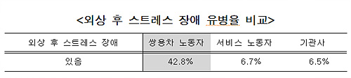 조사 결과, 파업 노동자 가운데 42.8%가 '외상 후 스트레스 장애'를 겪고 있었다. 이는 성적 희롱이나 폭력이 많은 서비스 노동자(6.7%)나 인명 사고를 자주 경험하는 열차 기관사(6.5%)보다 6~7배 높은 수치였다.