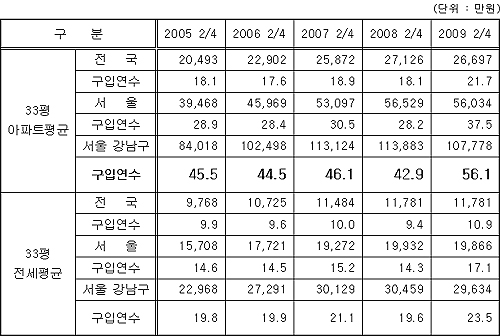 문제는 올들어 서울 강남 등을 중심으로 아파트 가격이 급등하면서 내집 마련을 위한 저축기간이 대폭 늘어났다는 점이다. 2009년 2분기 기준으로 서울 강남의 100㎡ 아파트를 구입하기 위한 저축 기간인 56.1년은 1년 전에 비해 13.2년(42.9년)이나 늘어났다. 지난해 미국발 금융위기의 여파로 부동산 가격이 일시 하락했다는 점을 감안해 지난 2007년과 비교하더라도 10년이나 저축 기간이 늘어났다. 지금 강남 등 일부 지역의 부동산 경기 과열이 얼마나 심각한 상황인지 보여준다고 할 수 있다.