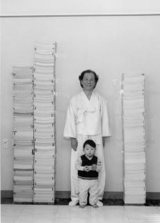 | ▲ <태백산맥>, <아리랑>, <한강> 원고 뭉치. 가운데는 작가의 손자. ⓒ시사IN북 |