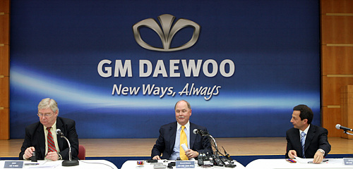 | ▲ GM대우 출범 7주년을 기념해 한국을 찾은 프리츠 헨더슨 GM 최고경영자(CEO)와 닉 라일리 GM 해외사업부문 총괄 사장은 이날 부평 본사에서 기자회견을 열고 "GM대우의 유상증자에 참여하겠다"고 밝혔다.ⓒ연합뉴스 |