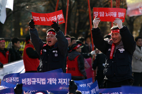 이날 국정감사에서도 한나라당 의원들의 질타가 이어졌다. 공통된 요지는 역시 '대화'였다. 조원진 한나라당 의원은 "양대 노총과 재계, 여야가 만나 충분한 대화를 나눠야 한다"고 했고, 같은 당의 강성천 의원도 "노동부는 노사를 설득해 합의를 이끌어내야 한다"고 당부했다.