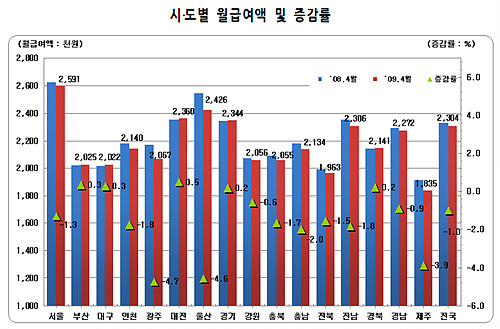 특히 지난해에 비해 평균 임금이 높아진 곳은 5개 지역에 불과했다. 이들 지역의 증가세는 가장 높은 곳이 대전의 0.5%, 부산의 0.3% 정도였으나 임금이 떨어진 지역의 하락폭은 더 높았다. 서울은 평균 월급이 1.3% 줄었고, 광주는 -4.7%, 울산은 -4.6%, 제주는 -3.9%였다.