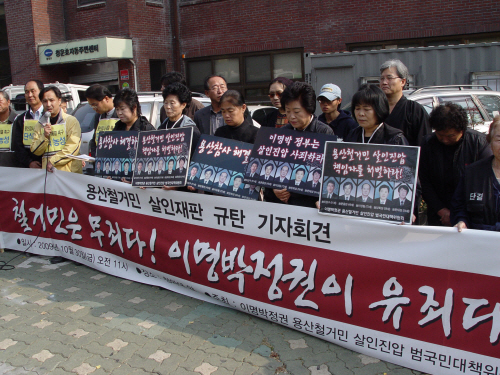 '이명박정권용산철거민살인진압범국민대책위원회'(범대위)는 이날 오전 11시께 서울 종로구 청운동 동사무소 앞에서 "철거민은 무죄다! 이명박 정권이 유죄다!"라는 제목으로 기자회견을 열었다. 지난 28일 열린 용산 참사 사건 1심 선고 결과에 관한 회견이다.