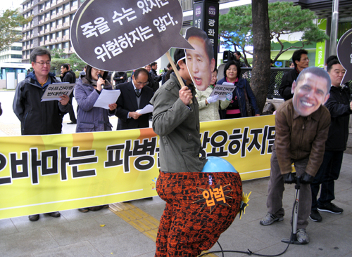 ▲ 이날 기자회견이 끝난 뒤에는 오바마 가면을 쓴 사람이 이명박 가면을 쓴 사람의 바지 안에 들은 풍선에 공기를 넣는 퍼포먼스가 진행됐다. ⓒ프레시안